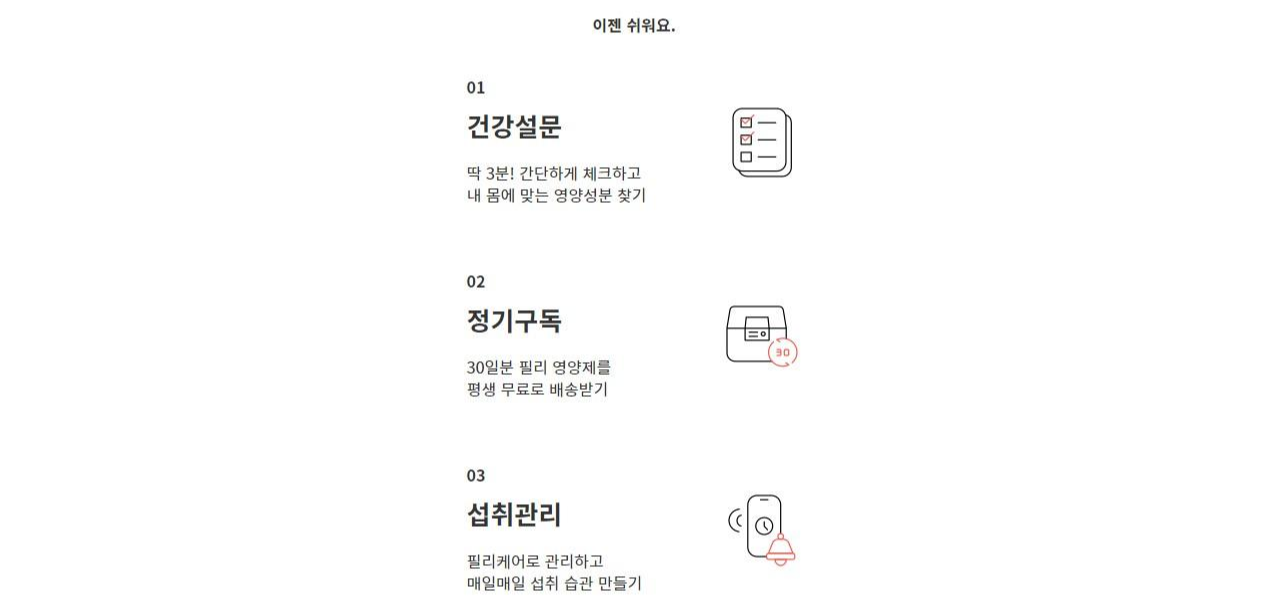 필리에서 영양제 구독을 신청하시면 매달 정기배송을 해주니까, 영양제가 얼마나 남았는지 매번 체크할 필요가 없습니다. 매달 빠르고 편안하게, 영양제가 떨어지기 전에 배송을 해주고 있으니까 더 많이 편리합니다. 또한 매주 소분해서 먹을 수 있는 케이스도 주기 때문에 더 잊어먹을 일이 없겠죠?