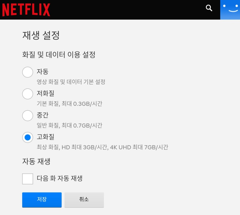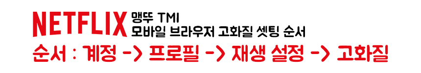 모바일 브라우저를 이용해서 넷플릭스를 접속해서, 위의 알려준 경로대로 따라가면 설정이 가능해! 순서를 차례대로 알려줄게. [계정 → 프로필 → 재생설정 → 고화질 → 다음 화 자동 재생] 이렇게 설정해주면 고화질로 언제든지 넷플릭스를 볼 수 있어! 어플에서도 가능하니까, 어플에서도 확인해봐!