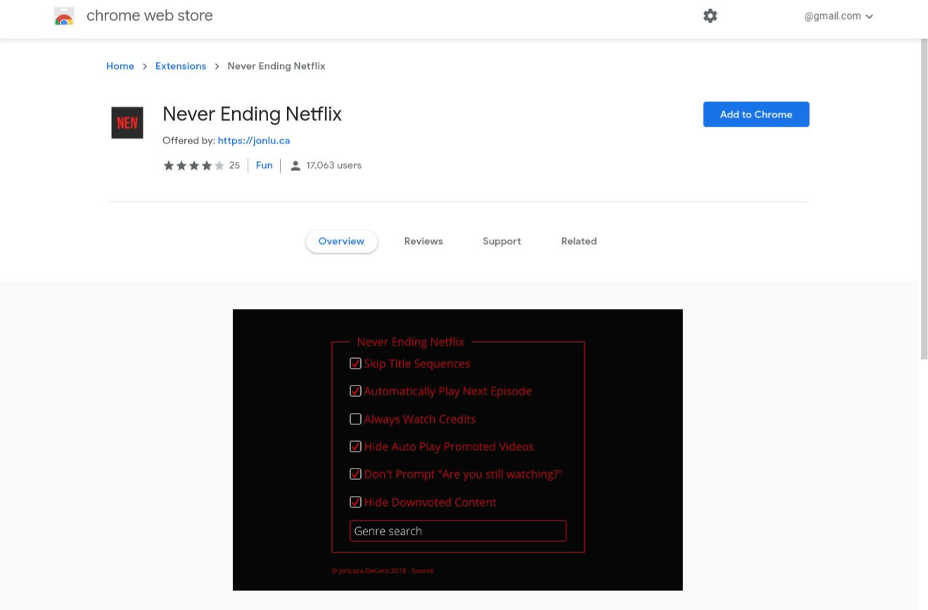 크롬 웹스토에 접속해서, [Never Ending Netflix]를 검색해봐! 그리고 우측에 보이는 [Add to Chrome]을 선택해서 크롬에 확장 프로그램을 설치해주면 끝!