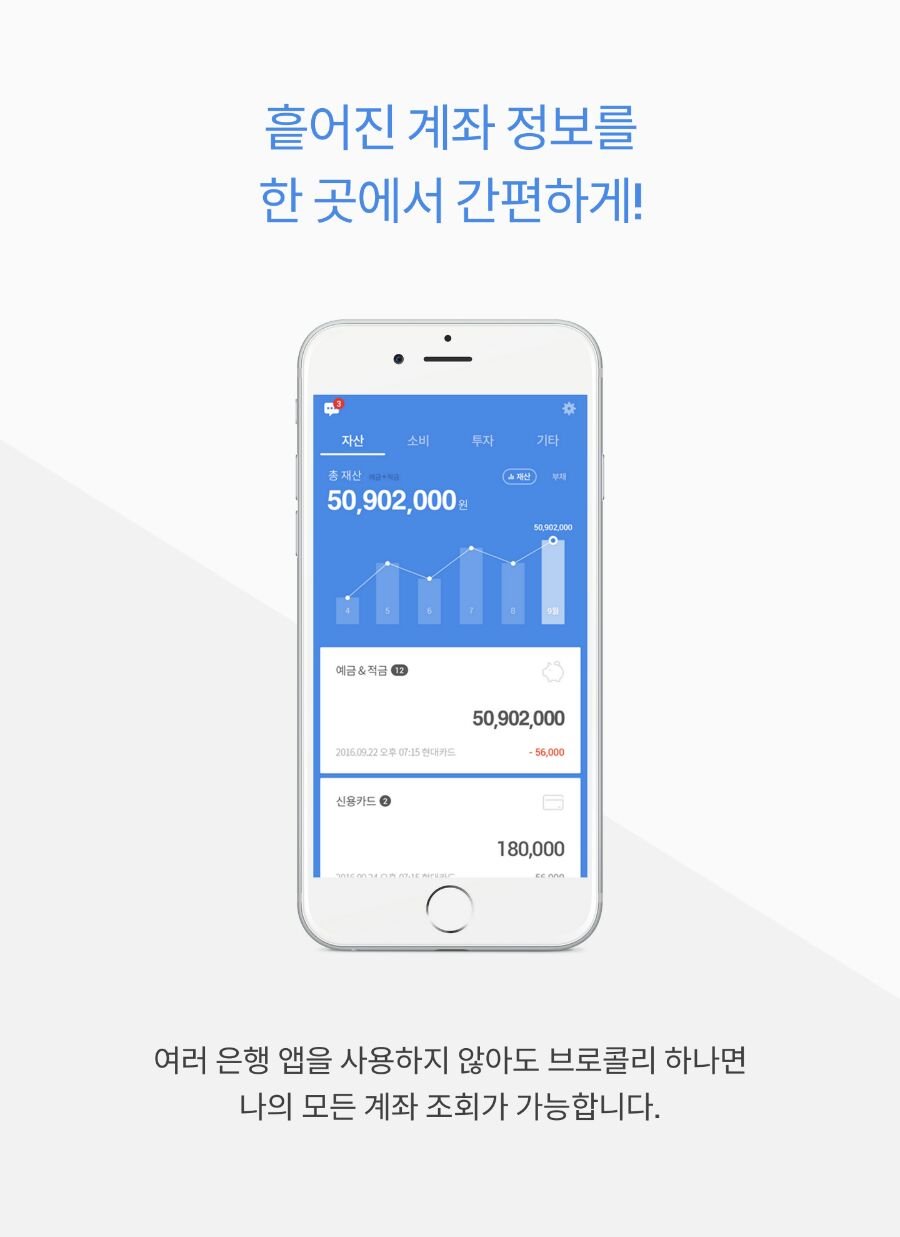 2016년 4월, 그융사 동기화 가계부기능을 기반으로, 쉽고 편안하게 가계부를 작성할 수 있다는 어플리케이션 [브로콜리] 입니다. [뱅크샐러드]와 비슷한 컨셉을 가지고 나왔기 때문에 많은 분들이 2개를 깔아서 이용하시더라구요!
