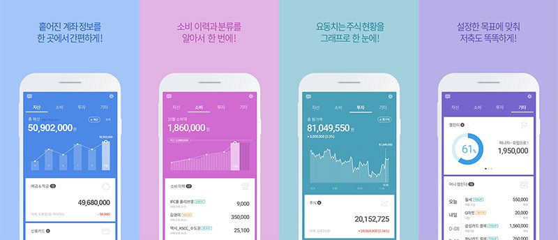 초반에는 간단하게 자신의 자산만 확인할 수 있는 시스템과 가계부 정도만 있었다면, 지금은 자신의 신용등급도 알 수 있는 기능이 있고, 다양한 투자상품들도 보여주고 있기 때문에, 이제는 본인이 직접 발로 뛰지 않고도 많은 정보를 얻을 수 있습니다.