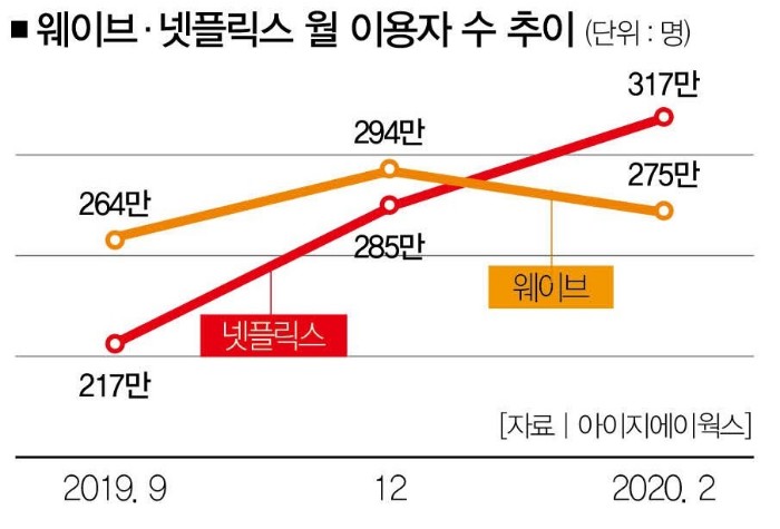 그러나 넷플릭스는 꾸준하게 성장하여, 지금은 317만명이 이용하는 역대급 성장세를 이어가고 있다. 물론 웨이브의 이용자수 감소는 마음이 아프다. 작년 9월과 12월만하더라도 넷플릭스보다 이용자수가 더 많았는데, 지금은 42만명 정도 차이가 나고 있는 것을 보면, 웨이브의 시작은 좋았지만 마무리가 허술하다 싶은거 있지?