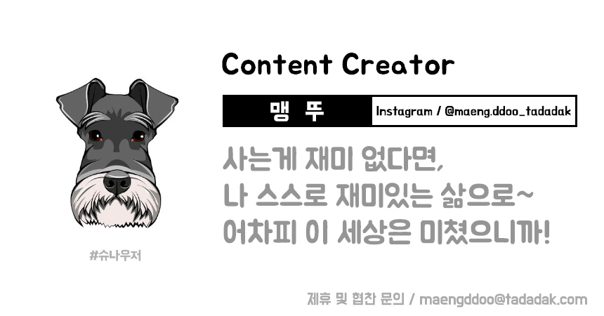 안녕하세요. 타다닥 눈누난냐의 맹뚜와 두치아빠 입니다!