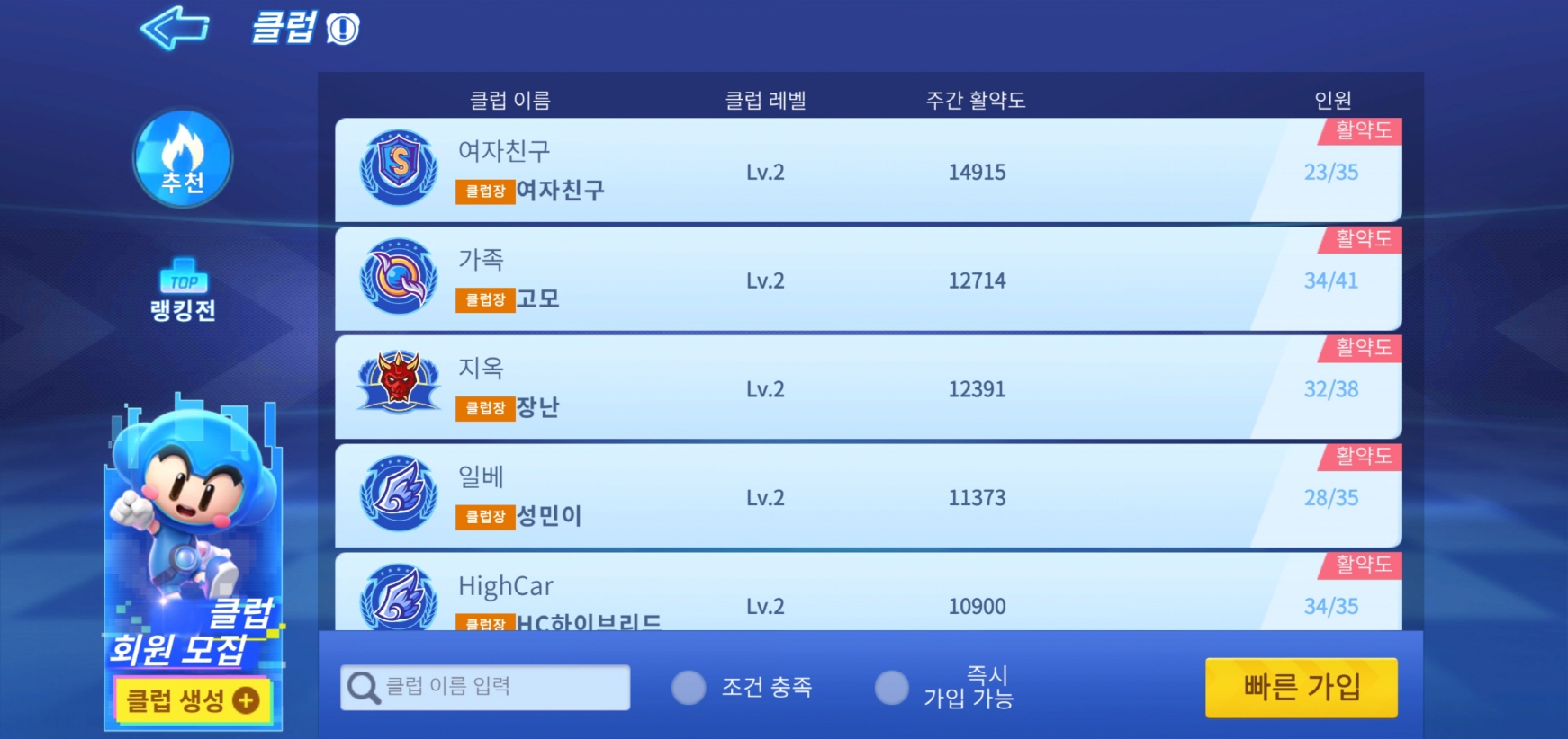 RPG게임의 길드와 비슷한 클럽입니다! 자신이 들어가고 싶은 클럽을 들어갈 수 있고, 반대로 자신이 클럽을 만들 수 있습니다! 맹뚜는 아직 클럽에 들지 않았어요! 어떤 클럽이 좋을까요?