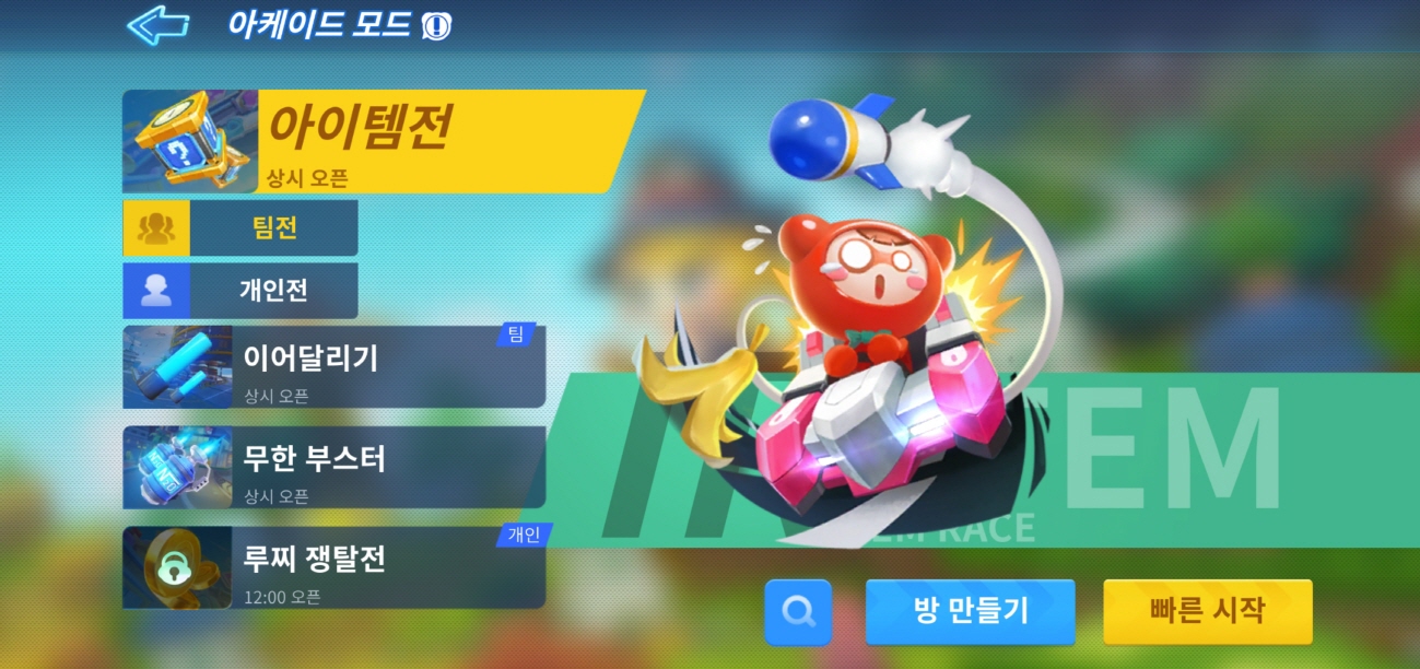 - 아케이드 모드 : 아이템 팀전 & 개인전 / 이어달리기 / 무한부스터 / 루찌 쟁탈전이 있습니다!