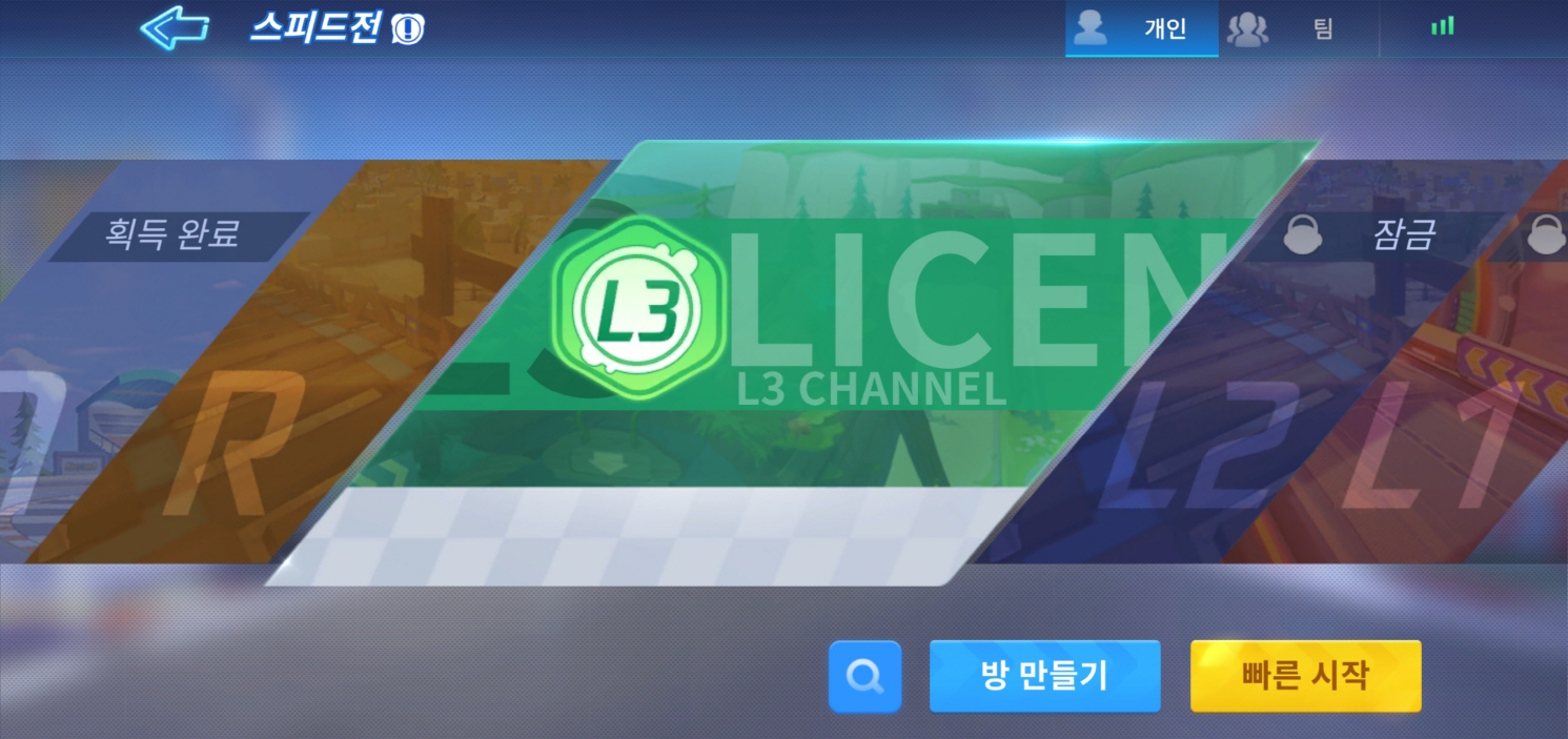 스피드전을 누르시면 각 라이센스에 맞게 게임을 할 수 있습니다. 라이센스는 <라이센스 테스트>에서 자신이 하고 따고 싶은 라이센스를 순서대로 클리어 해주시면 됩니다! 어렵지 않으니까 걱정하지 마세요! 맹뚜는 L3가 되었습니다!
