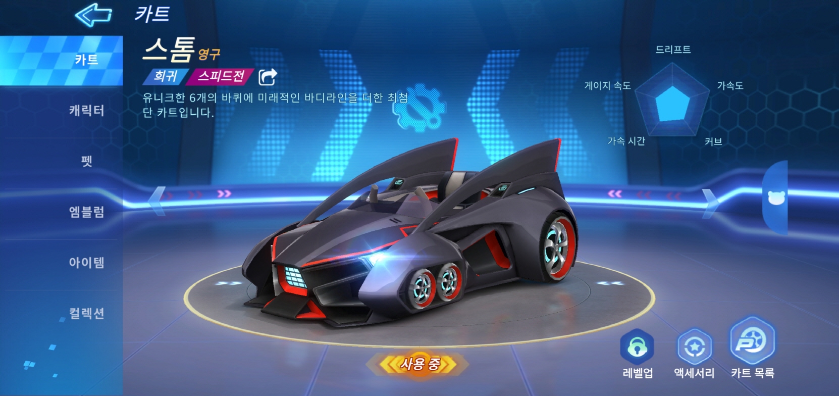 창고에 들어오시면 본인이 소유한 카트부터 캐릭터, 펫, 엠블럼, 아이템 등 다양한 것들을 확인할 수 있습니다. PC카트처럼 차에 사용할 수 있는 기간이 있습니다. 저는 이벤트로 영구적으로 사용할 수 있는 차량을 받았어요!