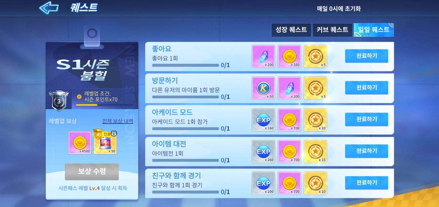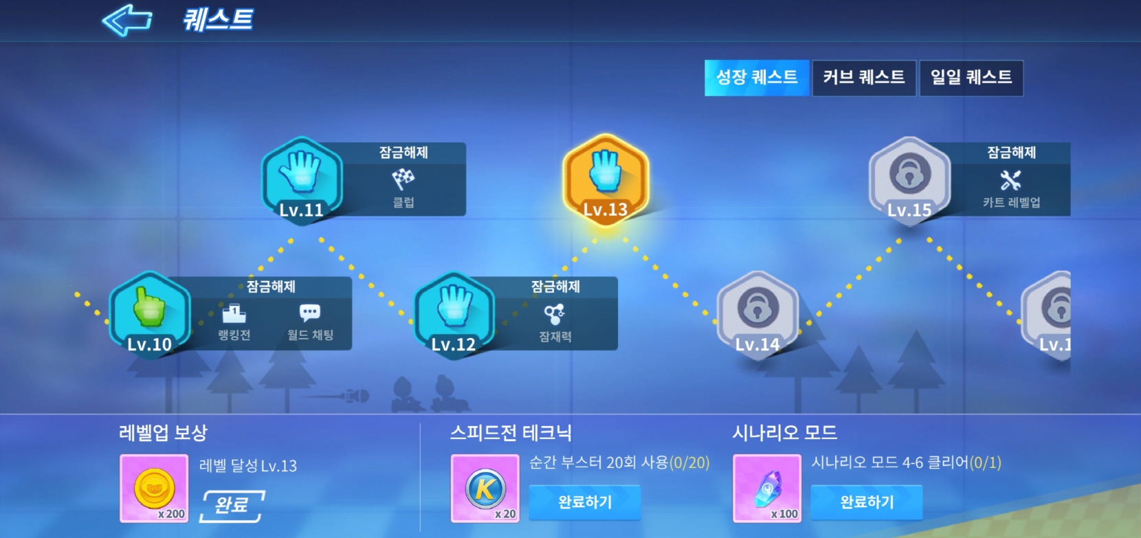 카트라이더 러쉬플러스는 다양한 퀘스트가 있습니다! 레벨업을 하면 보상을 받을 수 있는 <성장 퀘스트>와 매일 클리어 할 수 있는 <일일 퀘스트>가 있습니다! 꾸준히 플레이하면 다양한 보상을 받을 수 있으니까 꼭 퀘스트를 진행하시면 됩니다!