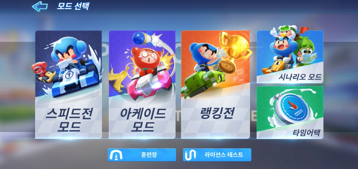 게임시작을 누르면 다양한 모드를 선택할 수 있습니다. 카트라이더 러쉬플러스의 게임 모드는 5개가 있습니다!