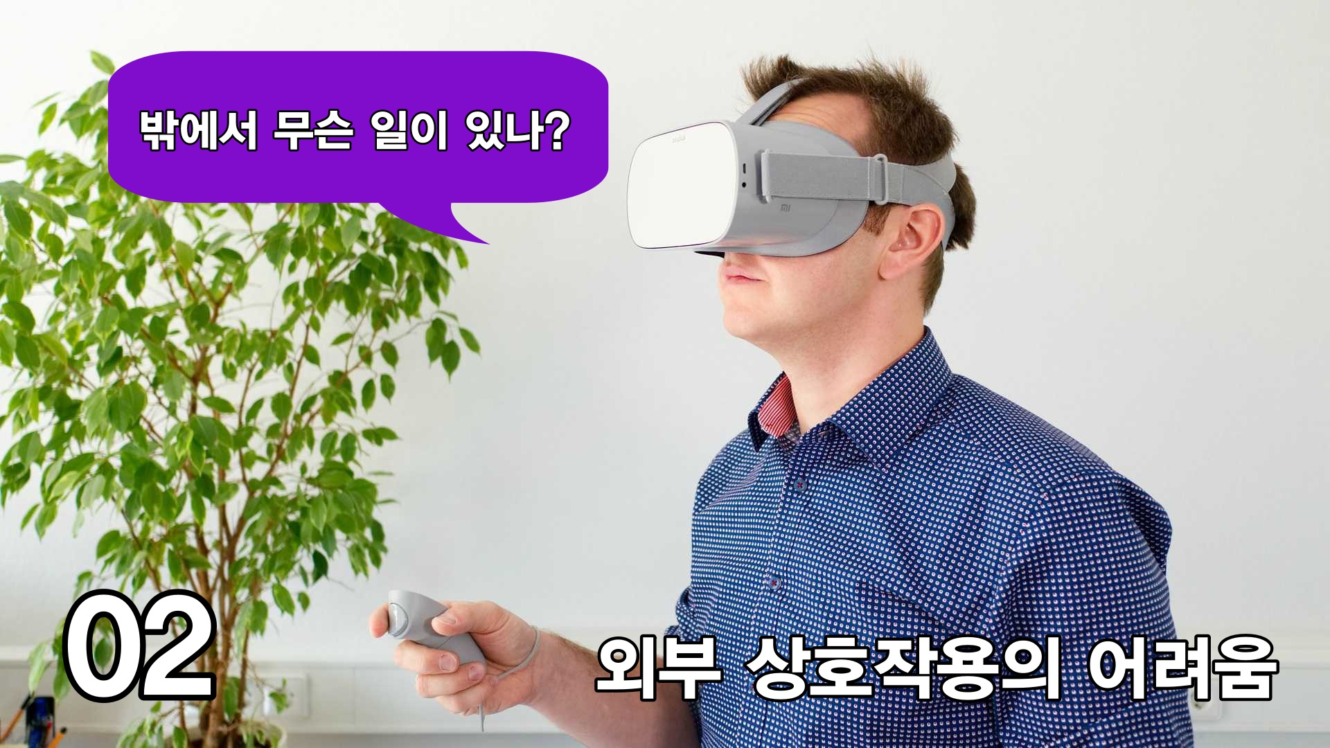 몰입감을 극한으로 올렸지만, 덕분에 외부와의 상호작용이 굉장히 어렵다. 화면 밖에서 무슨 일이 일어나는지 인지하기 힘들다. 그렇기 때문에 예기치 못한 사건에 대응하기 굉장히 어렵다는 단점을 가지고 있다. 이것도 앞으로 VR기술이 풀어나가야 하는 숙제 중에 하나다.