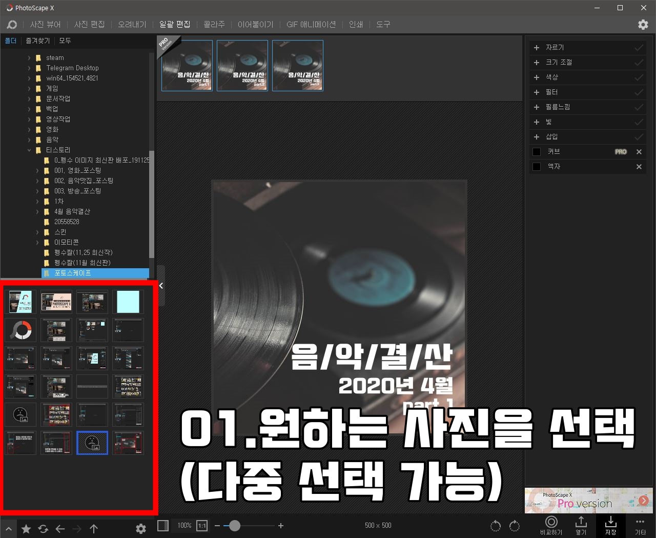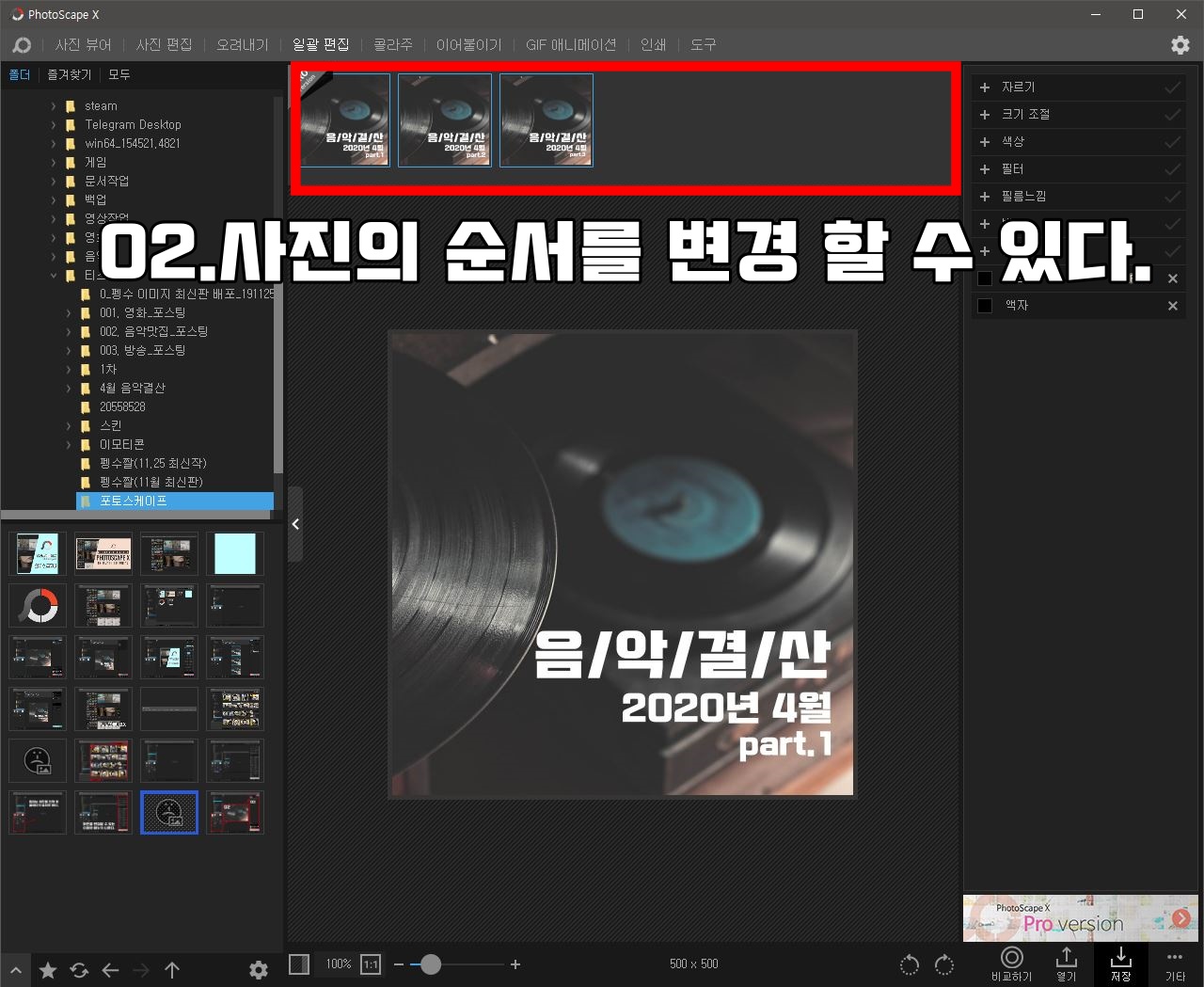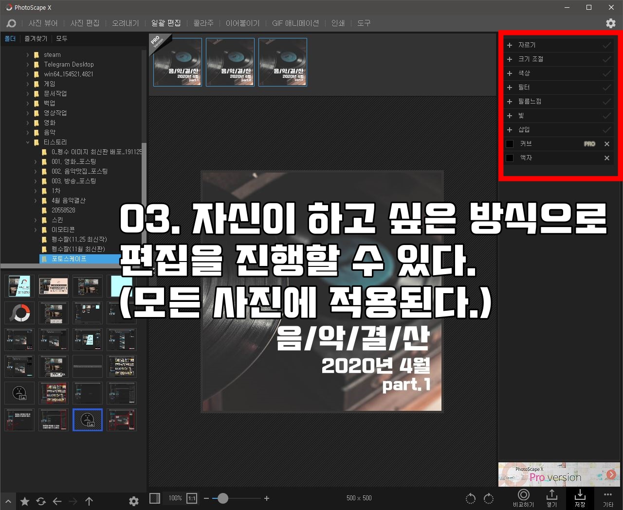 많은 사진을 하나하나 편집하기란 사실 쉽지 않다. 한번에 다양한 사진을 편집하고 싶은 사람들에게 안성맞춤인 기능이다. 크기 조절부터 필터, 액자까지 넣을 수 있어서 단시간에 많은 사진을 편집 가능하다. 필자가 블로그를 작성할 때 많이 이용한다.