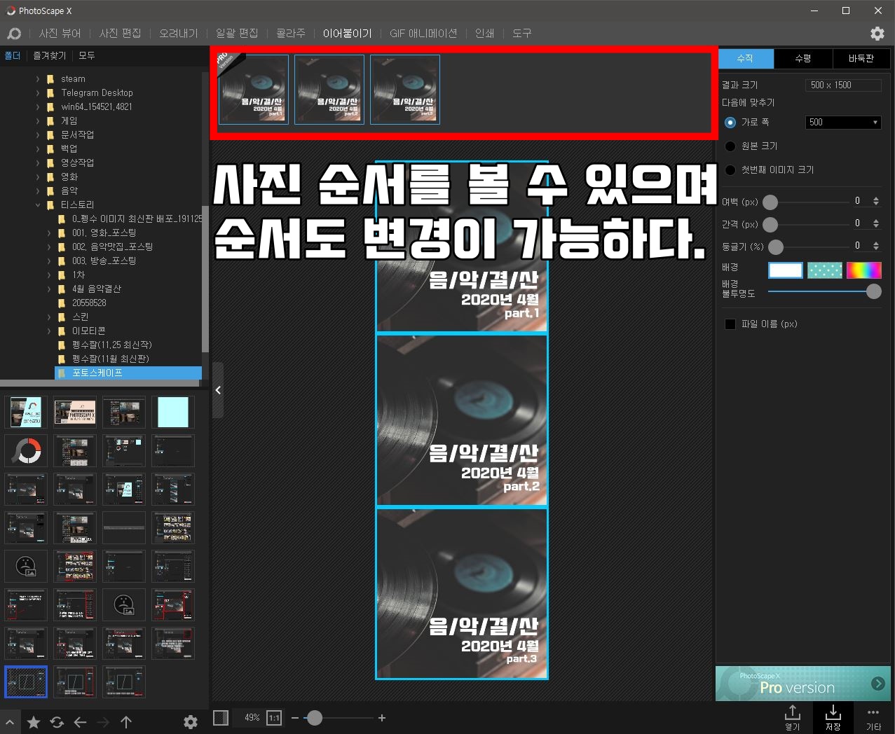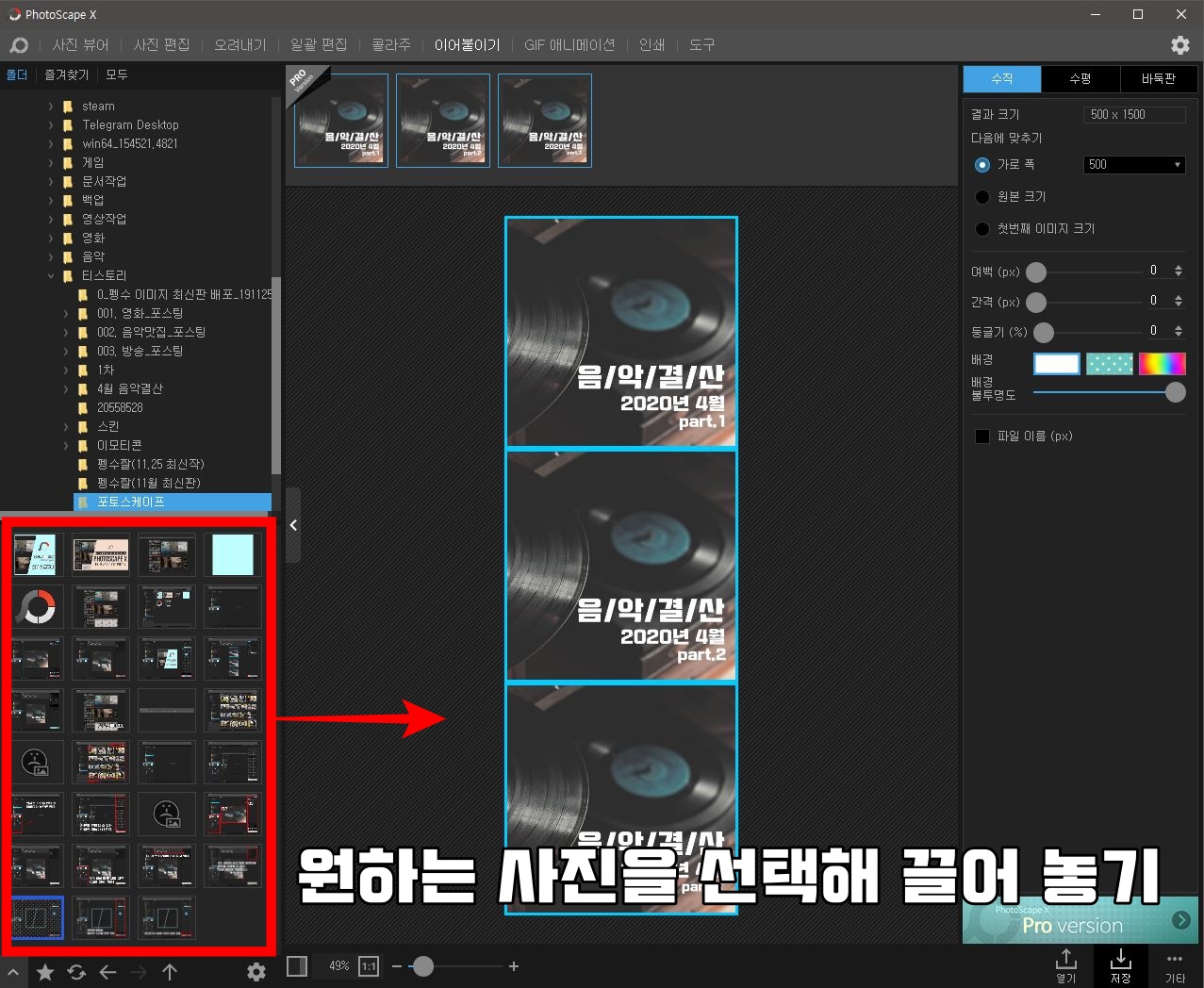 이어붙이기는 콜라주와는 다르게 파일을 한번에 붙이는 방법이다. 포토샵의 경우 하나하나 올려두고 사진 사이즈도 맞춰야 하지만, 포토스케이프면 원하는 사진만 올려두면 자동으로 만들어준다. 수직으로도 가능하고, 수평으로도 가능하며, 바둑판으로도 가능하다.