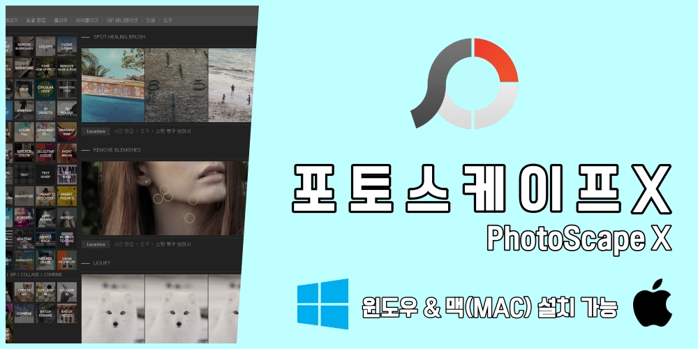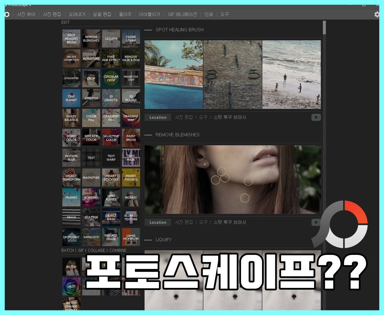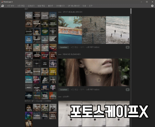 <포토스케이프 X>의 설치가 끝나면 다음과 같은 화면을 만날 수 있다. 맨 처음에 보이는 화면은 포토스케이프로 할 수 있는 다양한 사진 편집을 한눈에 볼 수 있는 페이지다. 동영상으로도 볼 수 있으니까, 설치를 하면 어떤 기능이 있는지 먼저 확인을 하자.