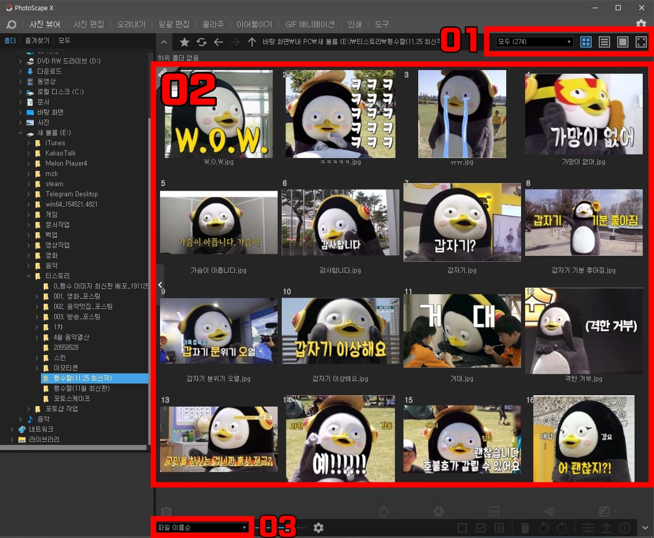 사진 뷰어는 간단하게 사진을 볼 수 있는 곳이다. ①부분에서 자신이 원하는 파일만 골라서 볼 수 있는 기능을 제공한다. 이를 통해서 자신이 원하는 포맷의 파일만 볼 수 있다. ②번은 해당 폴더의 사진을 빠르게 볼 수 있다. ③번은 파일 정리하는 순서를 정해서 이름 순서, 크기 순서, 슈정 날짜 순서 등 다양한 순서로 정할 수 있다. 이런 부분에서는 포토샵보다 좋은 것 같다.