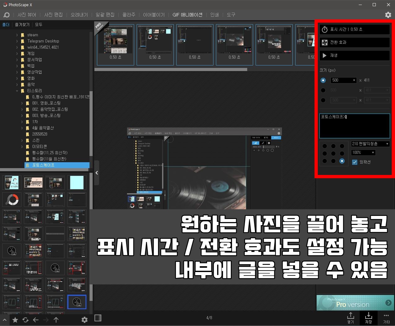 GIF 애니메이션을 포토샵에서 만드려면 엄청난 시간을 들여야 한다. 기능도 복잡하거니와 처음 시작하는 사람들은 어떻게 해야하는지 감도 잡을 수 없다. 그러나 포토스케이프는 처음 시작하는 사람들도 바로 GIF를 만들 수 있는 모습을 보여준다. 간단하게 사진만 넣어주고, 전환효과와 표시 시간을 설정해주면 바로 GIF 애니메이션을 만들 수 있다.