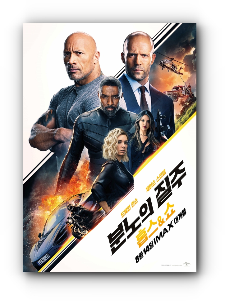 분노의 질주이 외전으로 돌아왔다. 기존에 나오는 매인 배우들을 제외하고, FBI의 요원 홉스와 청부 살인자 쇼가 만나서 펼치는 이야기다. 자동차 액션보다는 화려한 격투를 보는 재미가 더 많아졌던 편이라고 생각한다. 개인적으로는 카체이싱이 줄어들어서 매우 가슴이 아프다.