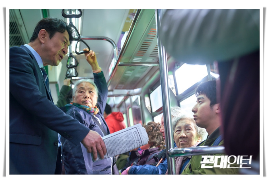 <꼰대인턴>은 이런 꼰대력을 충만하게 가지고 있는 사람들에게 젊은 세대가 반기를 드는 것이 아닌, 그 위치에 있는 사람을 최하위 계층으로 내리는, 이른바 입장 역전 코미디를 보여주는 드라마라고 할 수 있습니다. 한마디로 지금의 부장님 위치에 있는 사람이 신입 인턴사원으로, 신입 인턴 사원이었던 사람이 부장으로 올라가서 서로의 입장이 되어보는 것이죠.