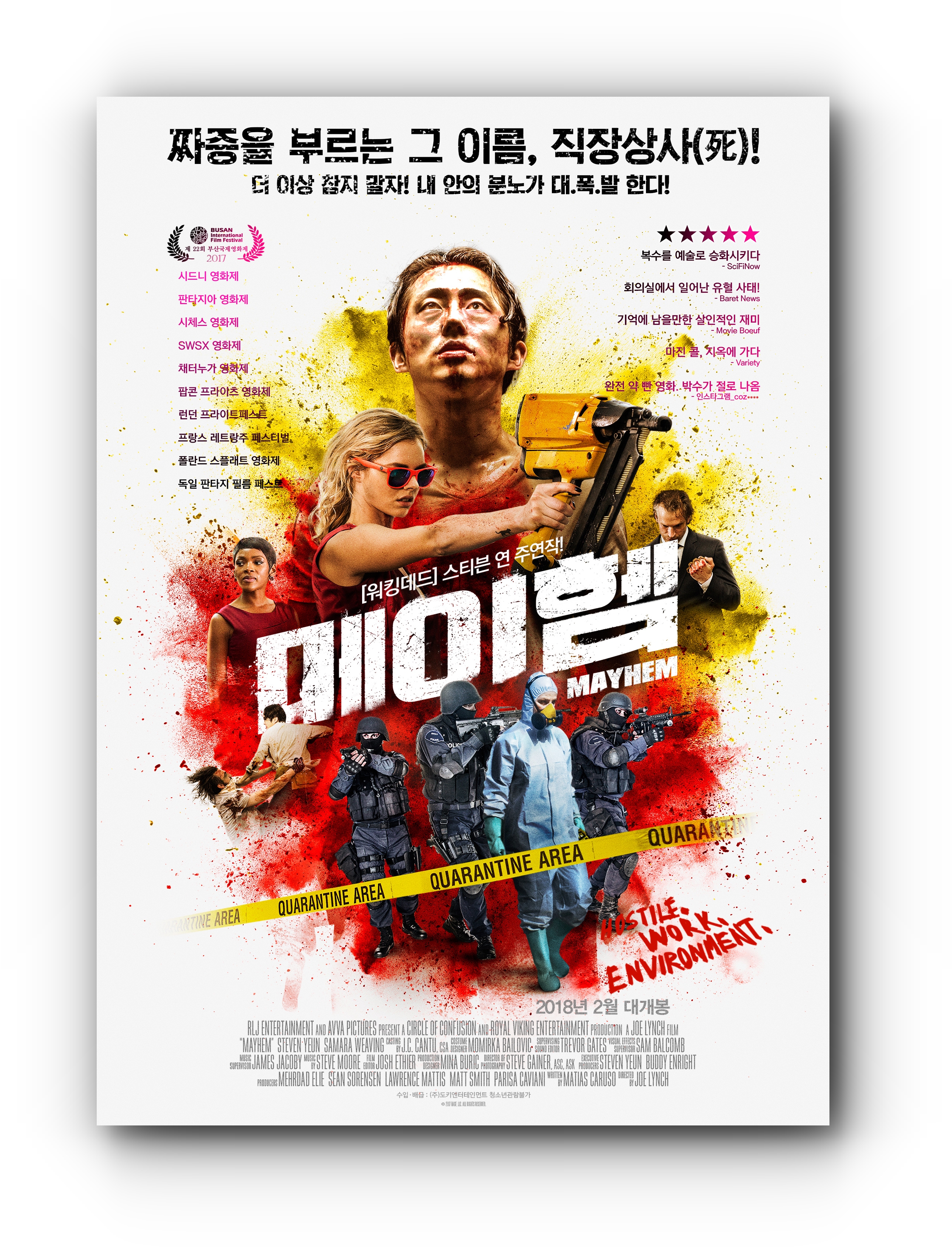 영화 <메이헴>은 스트레스를 유발하던 직장 상사를 비롯하여, 회사에 쌓인 분노와도 같은 마음을 복수로 풀어낸다는 설정이 재미있게 느껴지는 영화 입니다. 포스터에서 볼 수 있듯이 B급 무비의 매력을 보여주는 영화와도 같지만, 요즘 직장에서 받는 스트레스가 많은 사람들에게는 이 영화가 매우 즐거움을 줄 수 있을 것 같다는 생각이 듭니다.