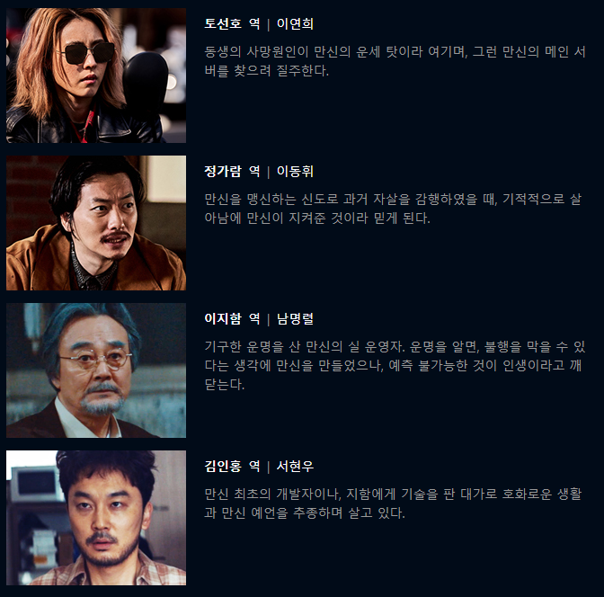 시놉시스 높은 적중률을 자랑하는 인공지능 운세 서비스 ‘만신’을 신격화하고 맹신하는 사회에서 각자의 아픔을 가진 선호와 가람은 만신 개발자를 직접 찾아 나서게 되고, 결국 예상과는 다
