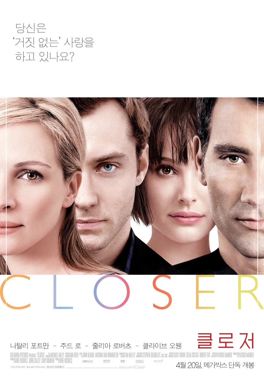 이 영화는가수 Damien Rice의 <The Blower's Dayghter>이라는 OST로 유명해진 작품이니다. 원래는 연극 공연으로 유명했던 클로저스가 한 때는 서로 사랑했으나, 시간이 갈수록 엇갈리는 네 남녀의 감정 변화를 덤덤하면서도 가슴 아프게 잘 표현한 작품입니다.