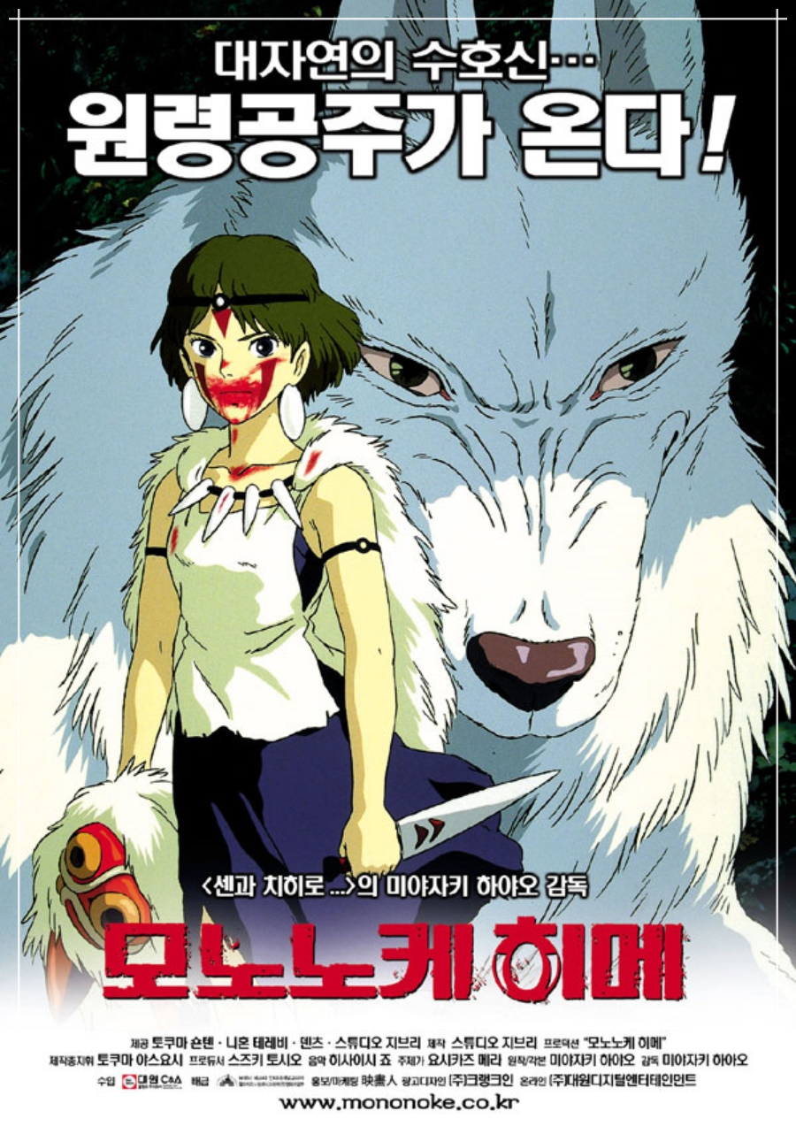 애니메이션하면 떠오르는 제작사 양대 산맥 중에 하나인 "지브리 스튜디오"의 작품 <모노노케 히메(원령공주)> 입니다. 환경문제, 인간의 욕망, 자연의 섭리 등 다양한 부분을 우리에게 알려주는 애니메이션 입니다.