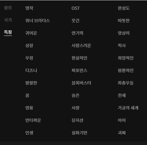 큰 틀로는 장르 / 국가 / 특징 이 있습니다!
