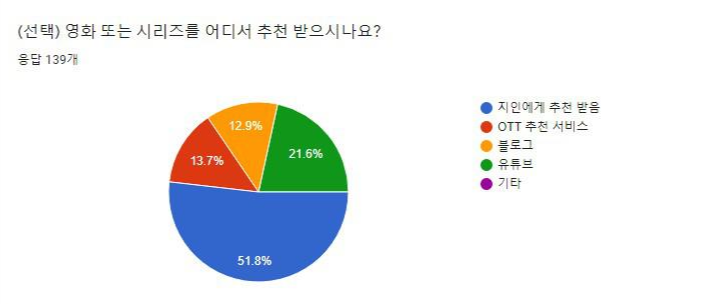 1위는 "지인에게 추천 받음", 2위는 "유튜브", 3위는 "OTT 추천 서비스", 4위는 "블로그"로 영화를 추천 받는 방식이 "지인의 추천"을 이용한다는 것입니다.