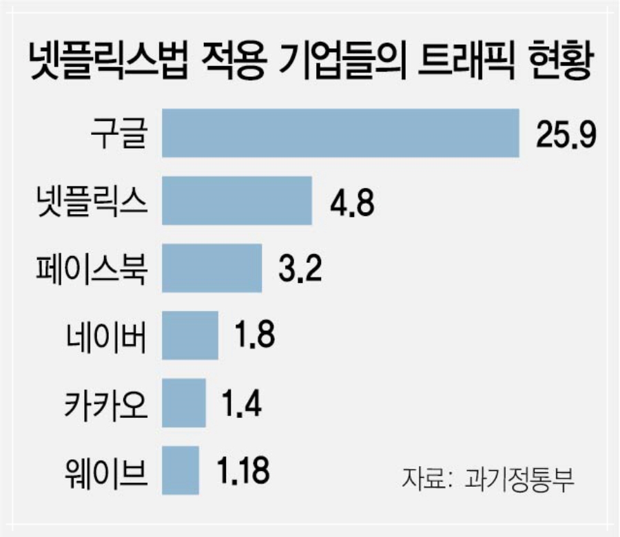물론 넷플릭스 입장에서 중재를 기다리는 것보다는 법원에 판결을 요청하는 것이 유리하다고 판단했을거야. 이러한 사태에 대응해 일각에서는, 국내 CAP들이 고액의 망 사용료를 지불하는데, 해외 사업자들은 무임승차 하려 한다는 역차별적인 구조를 부각시키게 되었지. 이들에게 망 사용료를 지불시키는게 입법 조치 필요성을 강조하게 되었고. 그래서 <넷플릭스법>이 탄생하게 되었지.