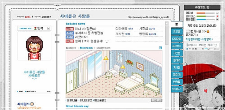 친구를 사귀거나 이성을 만나려면 싸이월드는 거의 필수였습니다. 특히 상대방의 미니홈피에 들어가면서 그 사람에 대하여 많은 것들을 알 수 있었습니다. 미니홈피는 현실과 떨어진 또 하나의 현실 공간이었습니다. 자신이 원하는 모양으로 꾸밀 수 있었던 곳이 바로 미니홈피였죠.