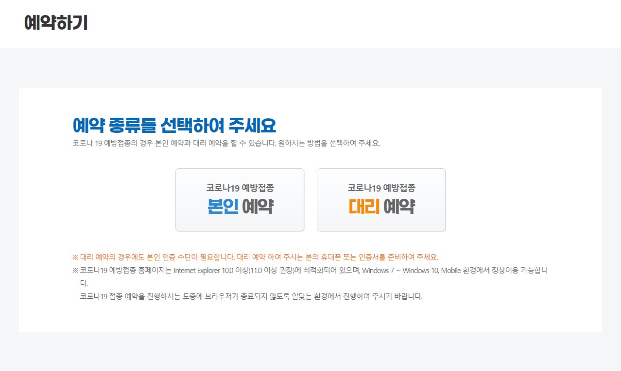 얀센 백신 신청을 위해서 <예약하기>를 누르면 ①본인예약, ②대리예약 총 2가지의 방법으로 예약이 가능합니다. 타다닥은 본인이 직접 접종해야하니까, "본인예약"을 진행했습니다. 물론 본인예약을 진행하는 경우에도 중간에 여러번 서버가 다운되면서 접속에 어려움이 있었습니다😢