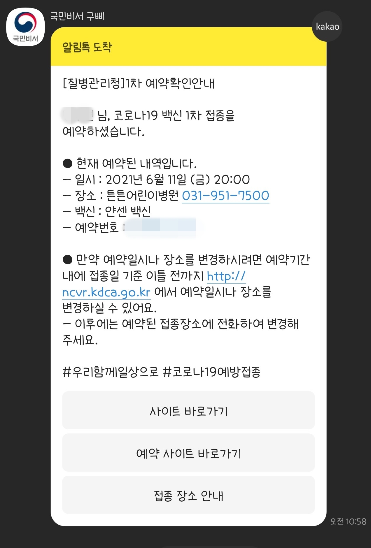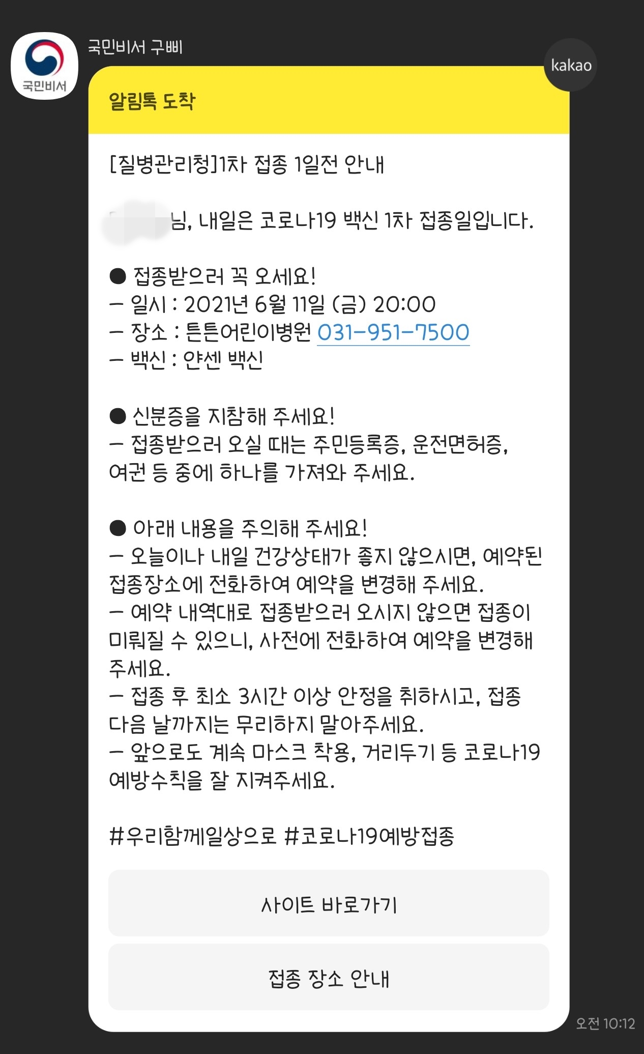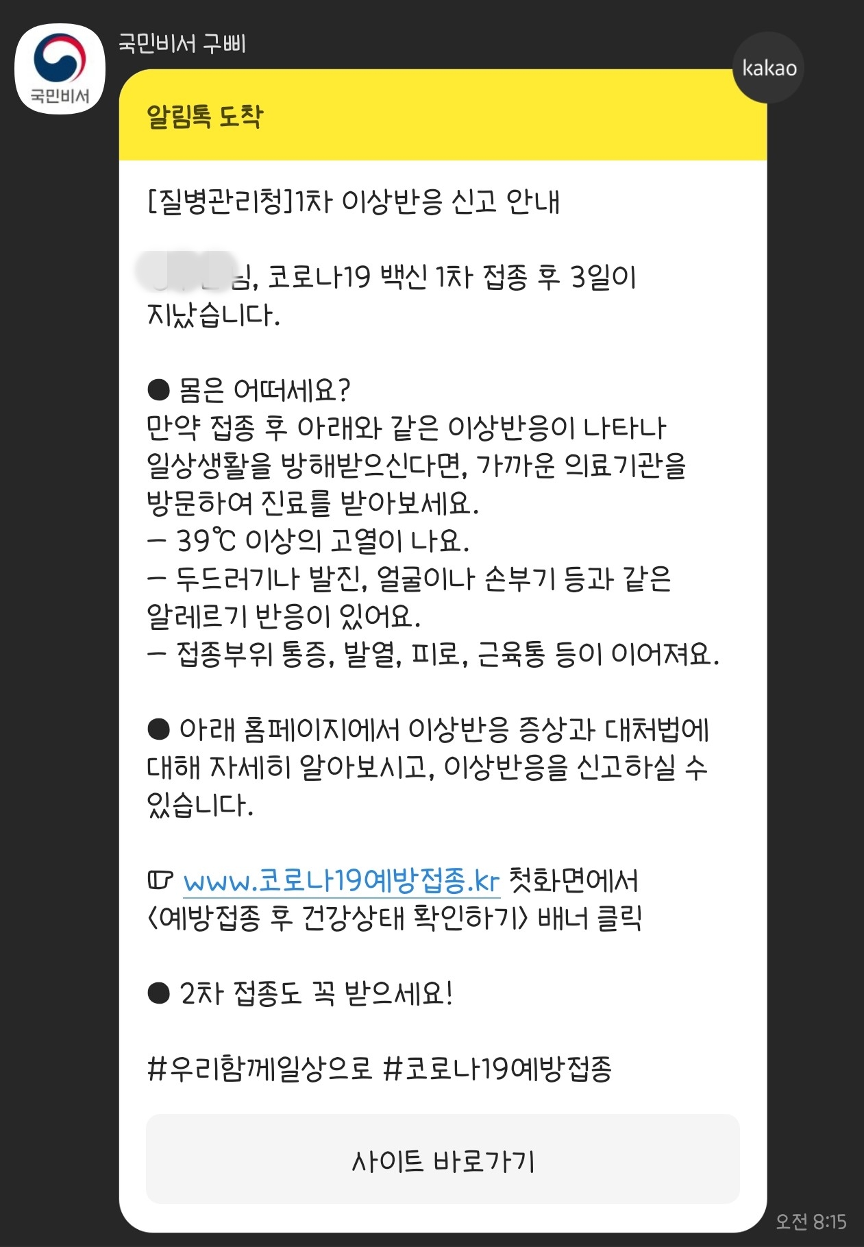 백신을 맞기 하루 전에 카카오톡을 통해서 <얀센 백신 접종>에 대하여 안내를 해줍니다. 시간과 장소를 알려주고 꼭 맞으러 가라고 알려주고 있습니다. 아!! 그리고 제일 중요한게 접종을 하러 간다면 필수로 "운전면허증" 또는 "신분증"을 챙겨가셔야 합니다. 본인 확인을 위해서 진행하는 것이니까 꼭 챙겨가세요!