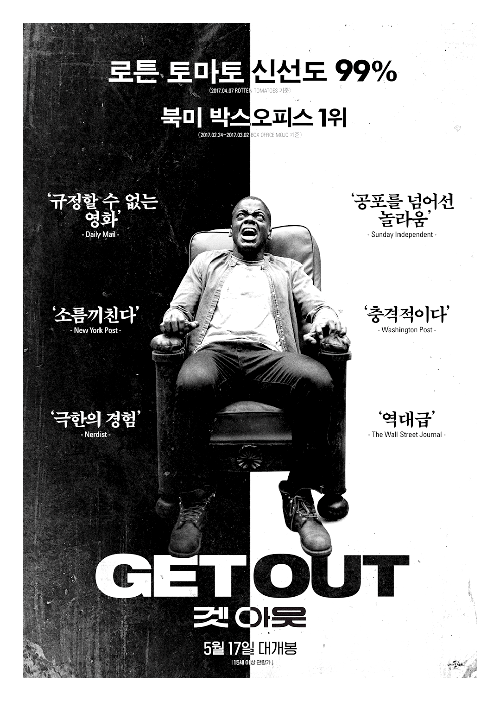 2017년 개봉된 <겟 아웃>은 흑인 남자가 백인 여자친구 집에서 초대를 받으면서 생기는 이야기를 다루고 있다. 개봉 당시 단 6일 만에 제작비 대비 10배 이상의 흥행 수익을 내며 단숨에 화제작으로 등극했다. 제 90회 아카데미상 각본상을 수상하며 231명의 평론가 중 만장일치에 가까운 230명의 평론가에게 극찬 세례를 받았다.