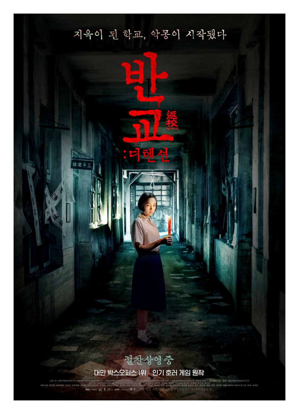 마지막으로 추천드릴 영화는 게임을 원작으로 하고 있는 영화 <반교 : 디텐션> 이다. 10~20대 사이에서 폭발적인 지지를 받음과 동시에 개봉작 중 좌석 판매율 1위를 달성했을 정도로 엄청난 작품이었다. 1960년대 대만의 자유가 억압된 시대를 배경으로 한 이야기로 역사적인 현실성과 맞닿으면서 극대화된 공포를 느낄 수 있는 영화다.