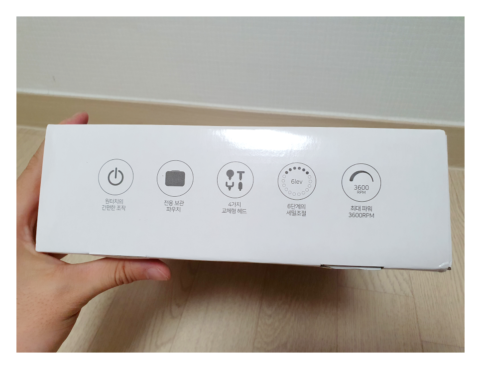 박스 뒷면에는 본품에서 사용할 수 있는 4가지의 헤드에 대한 자세한 설명이 함께 들어 있어요! 사용시 주의사항이 있으니까 주의사항을 꼭 읽어보시는 것을 추천드려요!
