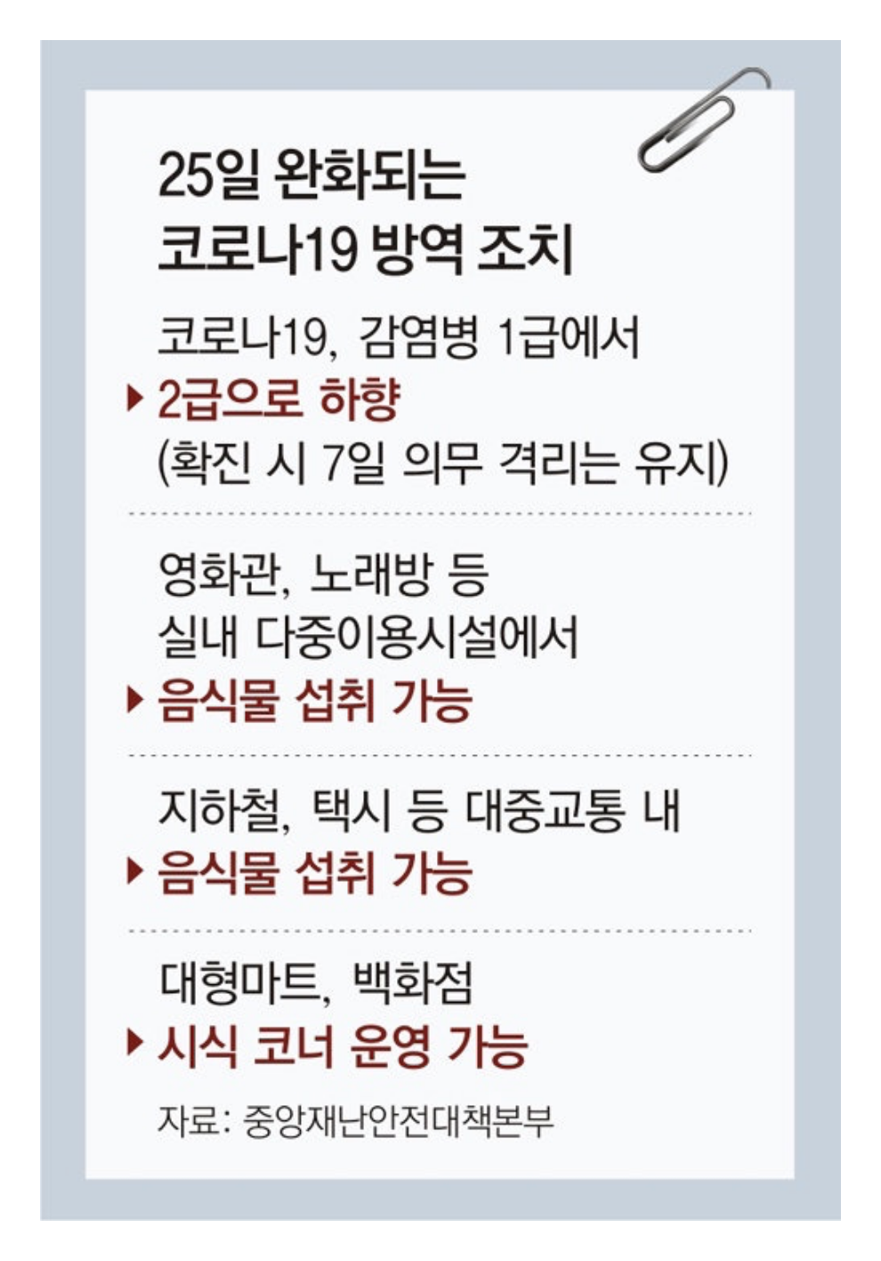 4월 25일 이후에 코로나 방역 조치가 변경됨에 따라서 영화관, 노래방 등 실내 다중이용시설에서 "음식물 섭취"가 가능하게 되었습니다! 이제는 영화관에서 팝콘을 먹으면서 재미있게 영화를 볼 수 있게 되었습니다.