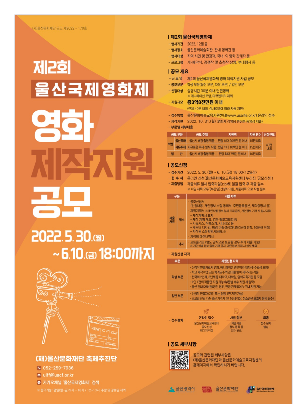 모집 대상은 전국 영화 & 애니메이션 학과 대학(원)생과 울산시민으로 학생 부문과 일반 부문으로 나뉘어서 진행한다고 합니다. 올해 사업은 40편 내&외의 프로젝트에서 총 3억 8천만원 규모의 제작비를 지원하며, 2021년 대비 약 1억 5천만원 이상 확대됐다고 합니다.