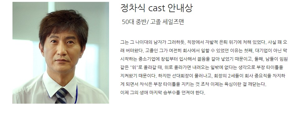 은퇴 위기에 처한 50대 고졸 세일즈맨 '정차식'을 통해 가장들의 이야기를 담은 드라마