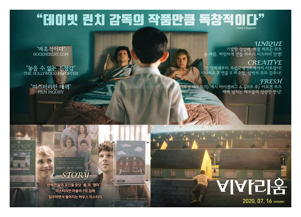 영화의 홍보 문구는 굉장히 특이합니다. 바로 "어떤 방향으로 향해도 집 앞에 다다르는 이곳에서 우리의 선택은 없다, 오직 살아갈뿐! 가장 완벽한 안식처가 되어줄 거에요, 영원히" 입니다. 처음에는 영화랑 별다른 접점이 없다고 생각했지만, 영화를 다 보면 공포감과 기괴함을 느낄 수 있는 문구입니다. 마치 현대인의 인생이 진짜 행복한지 시험해 보는 것 같은 느낌의 문구이기 때문이죠.