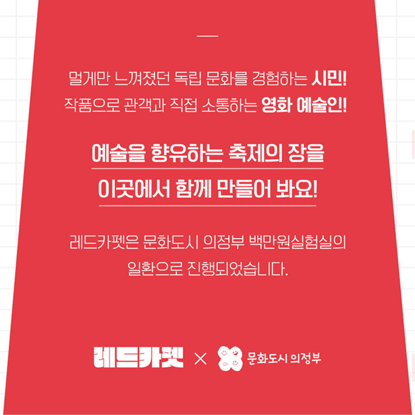 이번 의정부 영화제 <레드카펫>은 타지에서 진행하는 영화제에 참여하지 못하는 시민들에게 독립영화 문화를 경험하게 해줄 수 있게 하는 것을 목표로 하고 있습니다. 그리고 작품과 관객이 직접적으로 소통하는 GV도 함께 진행하여, 시민들에게 다양한 문화예술을 향유할 수 있는 축제의 장으로 나아갈 예정이라고 합니다.