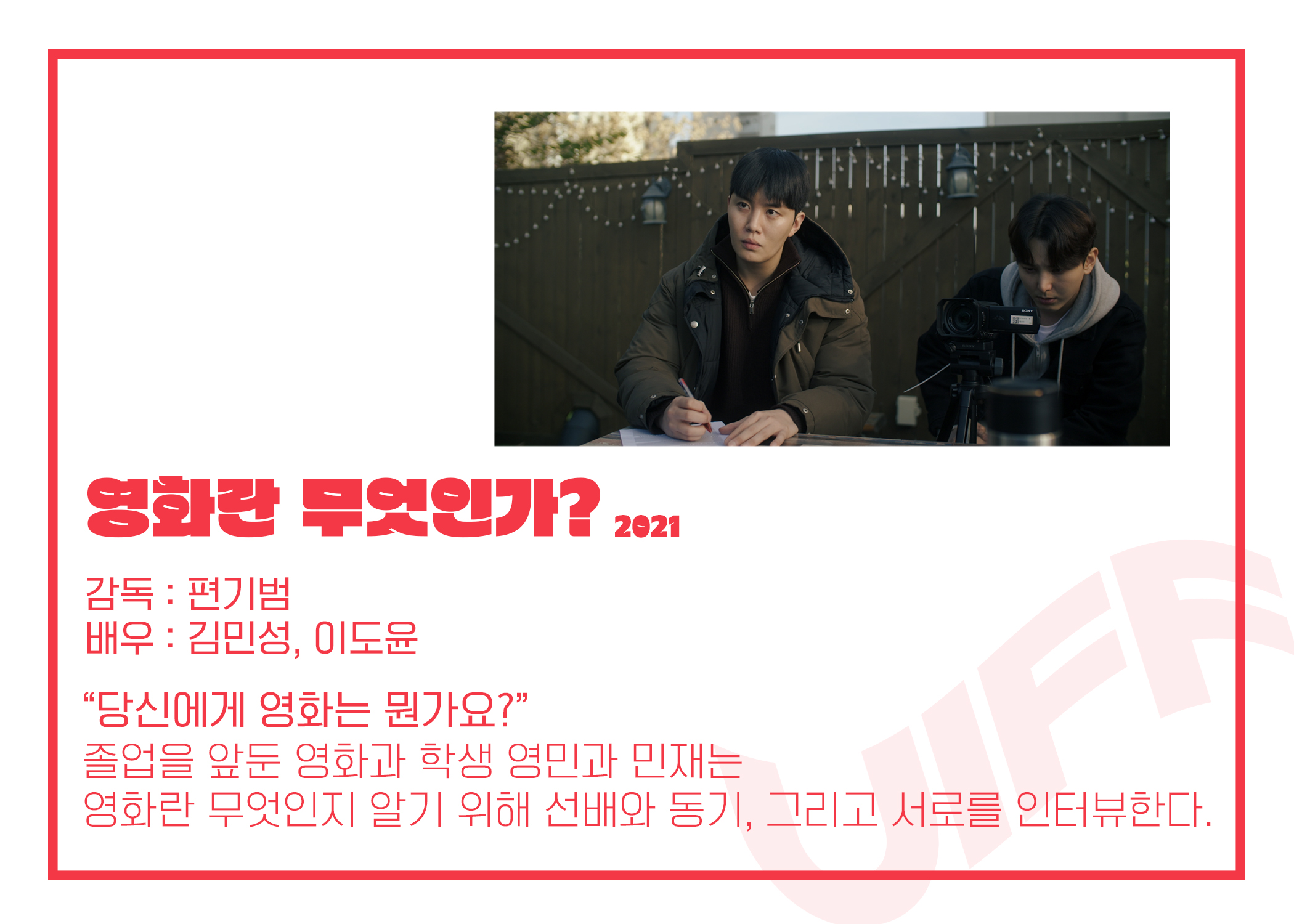 졸업을 앞둔 영화과 학생 영민과 민재는, 영화란 무엇인지 알기 위해서 선배와 동기, 그리고 서로를 인터뷰 하는 작품.